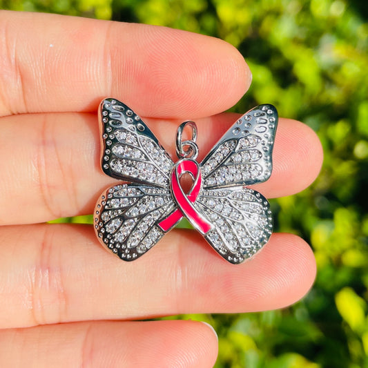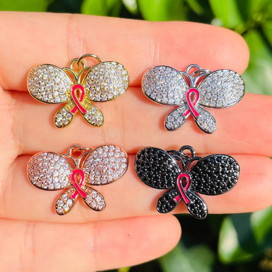 10pcs/lot CZ Pave Pink Ribbon Butterfly Charms - Breast Cancer Awareness