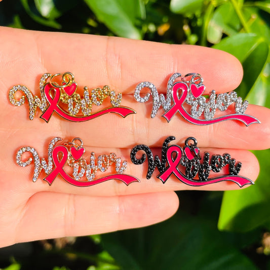 10pcs/lot CZ Pave Pink Ribbon Warrior Word Charms - Breast Cancer Awareness