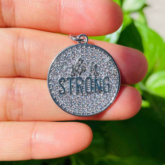 10pcs/lot 25mm CZ Pave Round Plate SHE IS STRONG Quote Charms