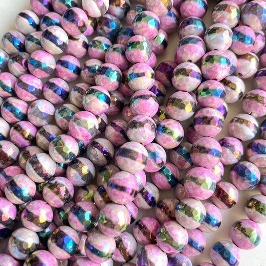 8mm Electroplated AB Black Stripe Pink Faceted Tibetan Agate Stone Beads