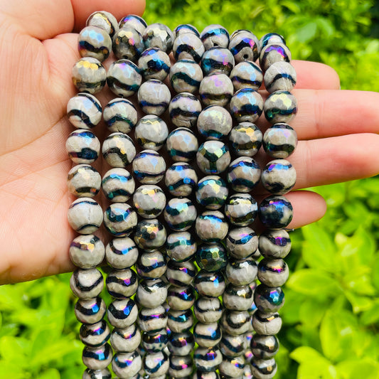 8mm Electroplated AB Black Stripe Gray Faceted Tibetan Agate Stone Beads