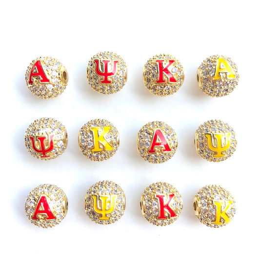 12pcs/lot 10mm Red Yellow Enamel CZ Paved Greek Letter "K", "A", "Ψ" Ball Spacers Beads
