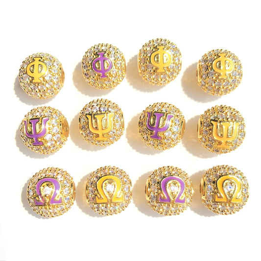 12pcs/lot 10mm Purple Yellow Enamel CZ Paved Greek Letter "Ψ", "Φ", "Ω" Ball Spacers Beads