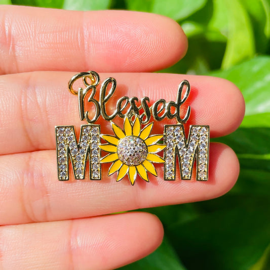 10pcs/lot 32*23mm CZ Pave Sunflower Blessed Mom Charms