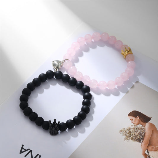 5 Sets/lot 8mm Rose Quartz Black Matte Stone Crown Bracelets Set for Valentine's Day