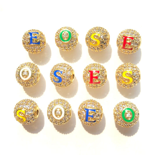 12pcs/lot 10mm Colorful Enamel CZ Paved Letter "O", "E", "S" Ball Spacers Beads