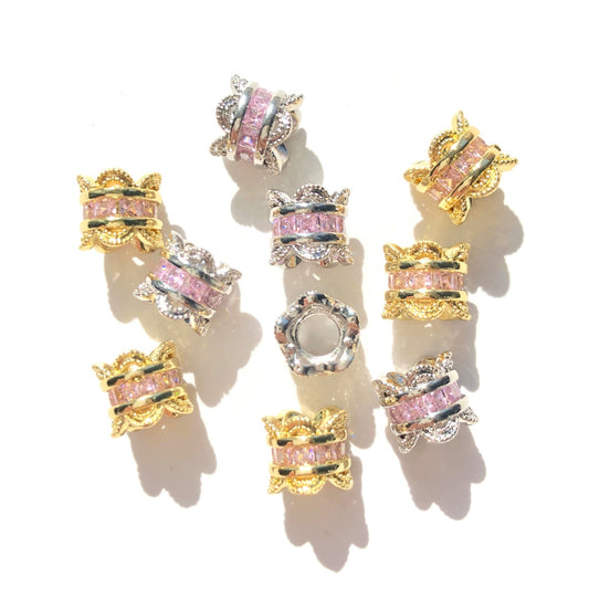 10-20-50pcs/lot 10mm Pink CZ Paved Big Hole Flower Rondelle Wheel Spacers