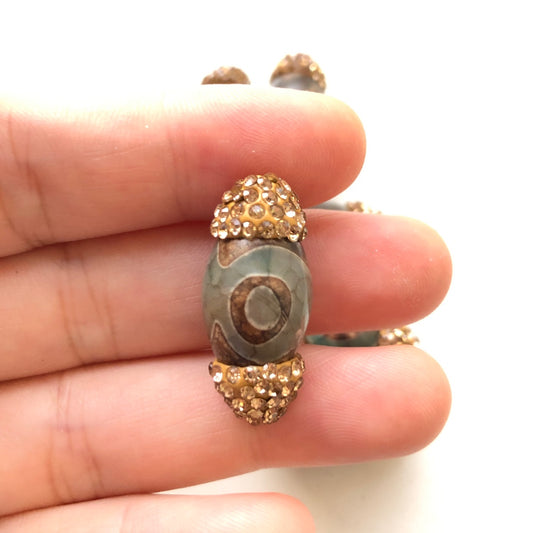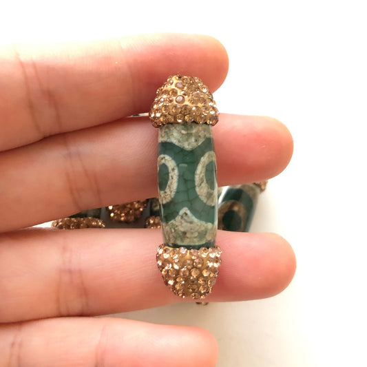 5pcs/lot Gold Rhinestone Paved Green Eye Dzi Tibetan Barrel Beads Focal Spacers